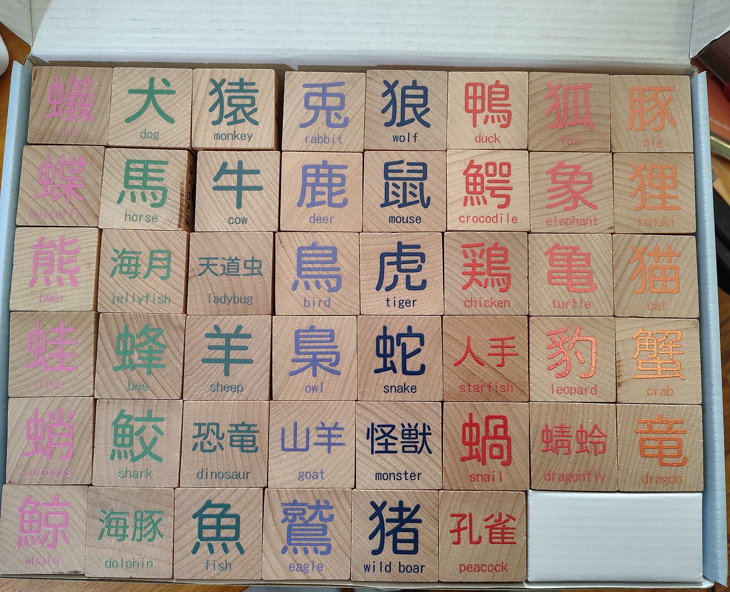 I found these letter blocks on Amazon. It’s really helpful for assembling words in a tactile manner for learning the character sets. One side of the block has Hiragana, another side Katana, another side has a Kanji character, etc. (The photo below only shows Kanji.)