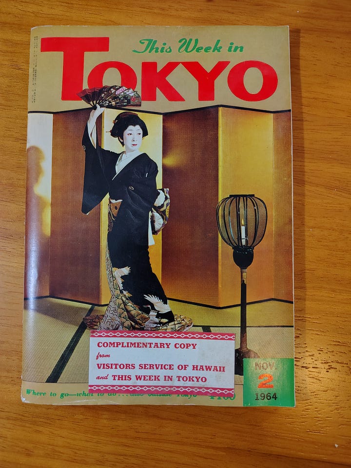 Japan on $5 a Day (1964 edition) and This Week in Tokyo, which covers the week of November 2, 1964. The latter is a remarkable find! Never Fear Tokyo is set during the 1964 Tokyo Olympics, which happened in October. I think I’ll shift the storyline to be the week just after the Olympics ended, which is the week of November 2, now that I have a detailed magazine on events and places during that week in 1964.